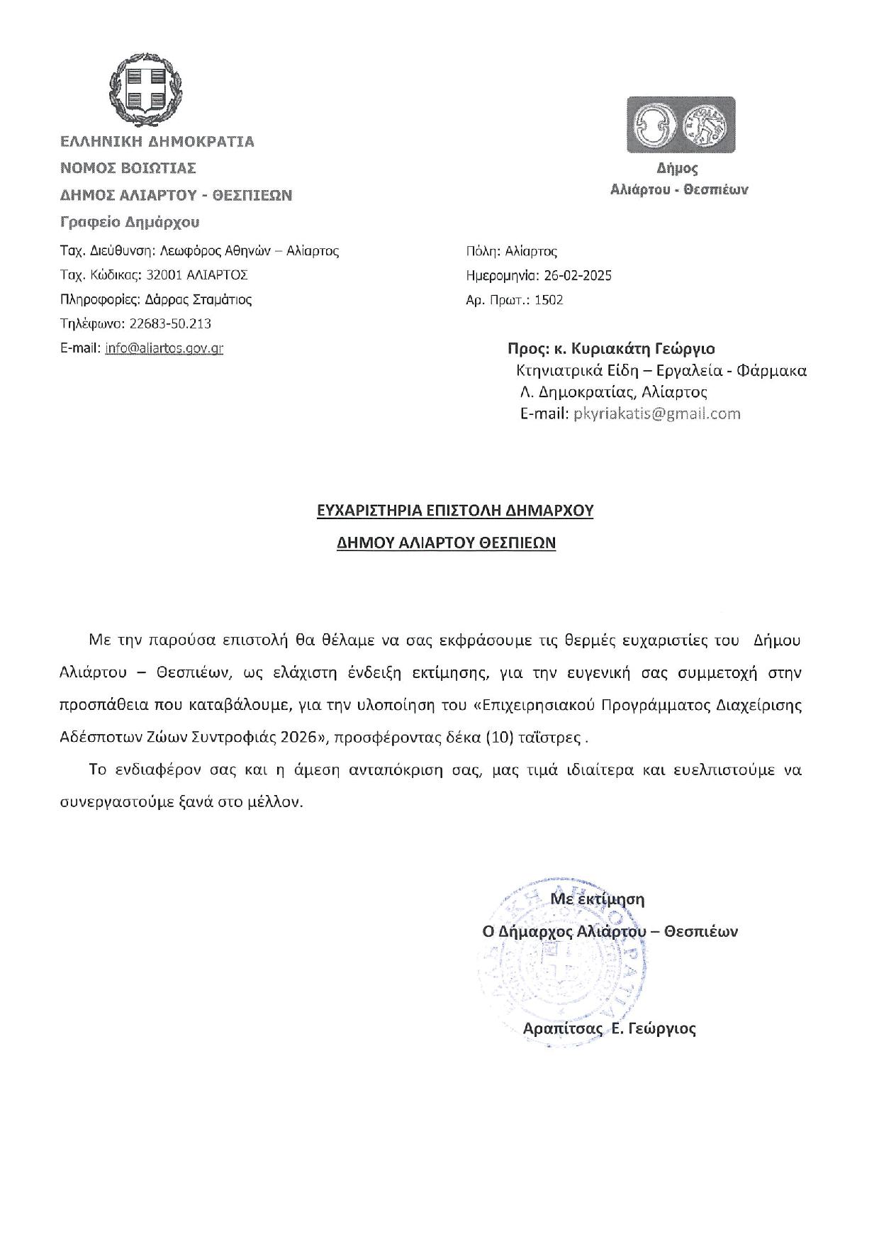 Ευχαριστήρια Επιστολή Δημάρχου προς κ. Κυριακάτη Γεώργιο