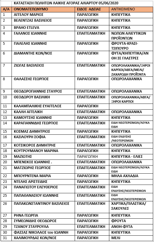 Ανακοινώνεται ο πίνακας των συμμετεχόντων πωλητών στη λαϊκή αγορά της Παρασκευής 5 Ιουνίου 2020.